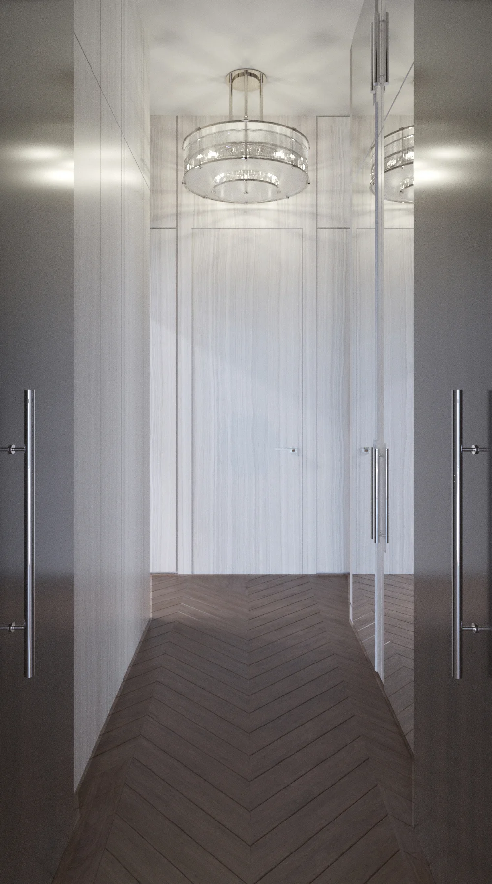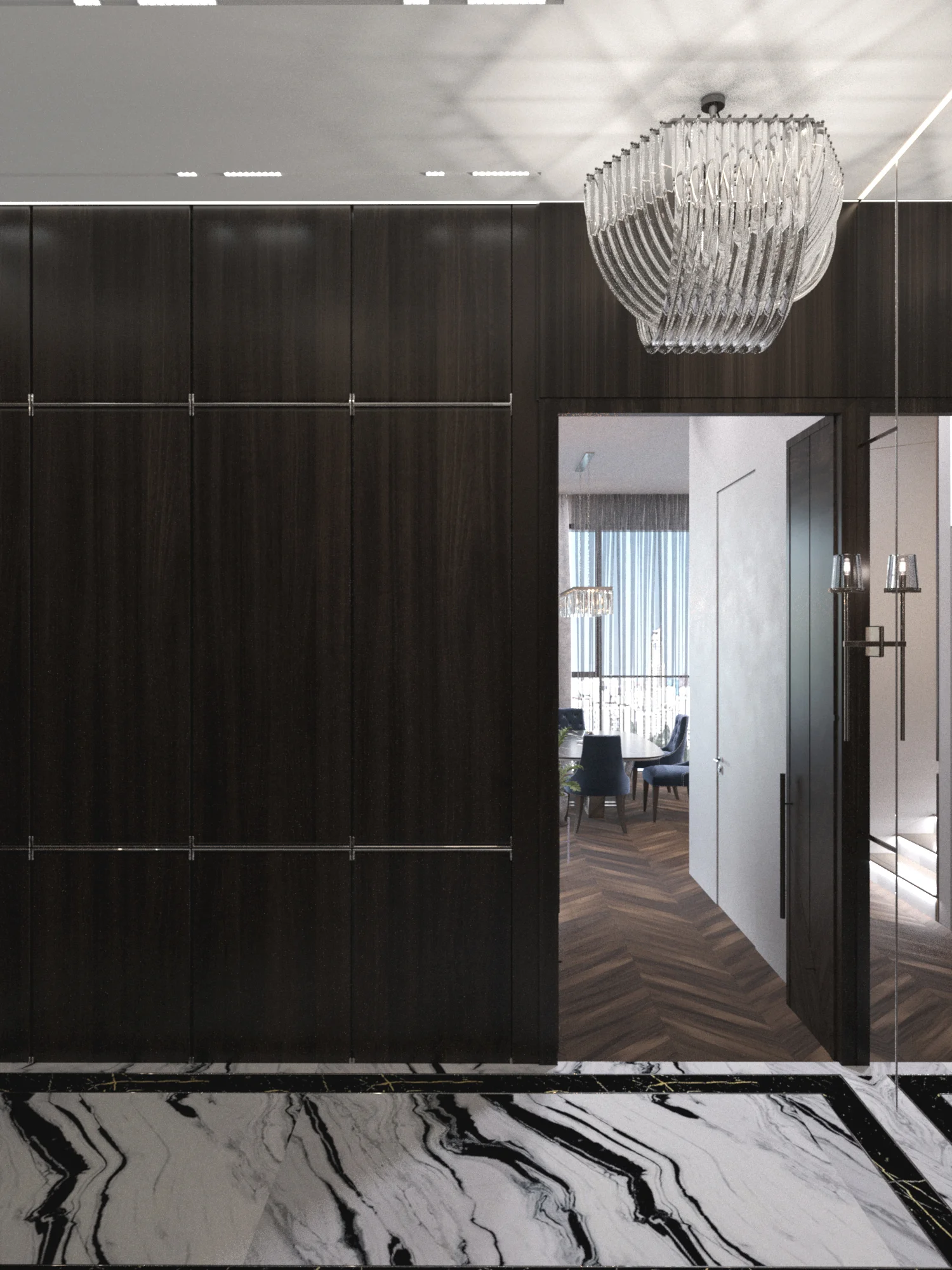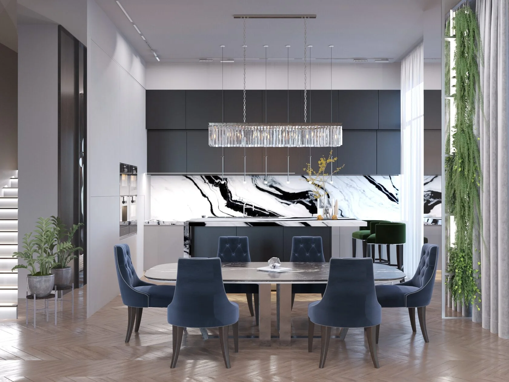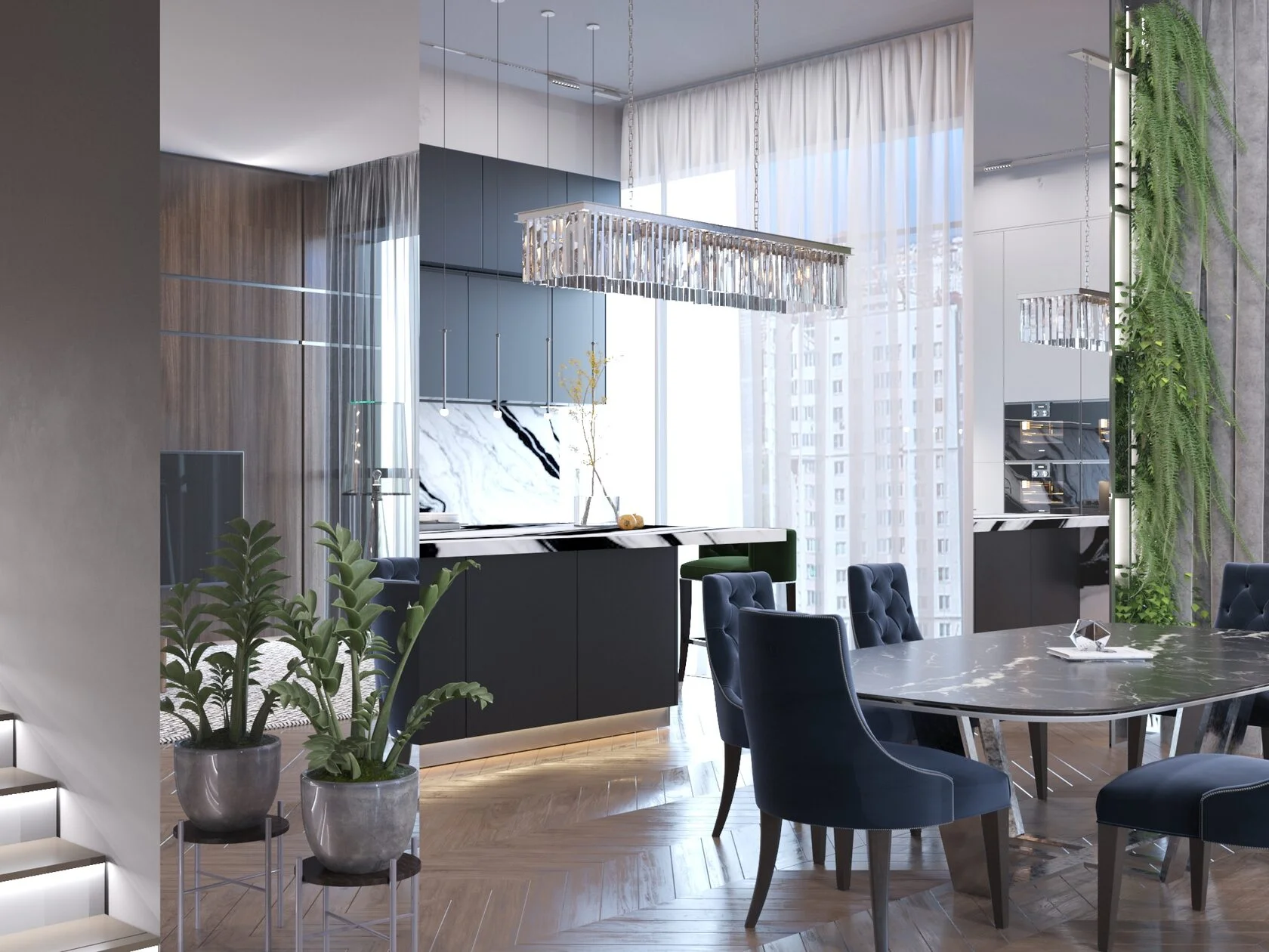 В прихожей всё спрятано за тёмными панелями. Крупный рисунок камня и тонкие линии подсветки задают ритм. Паркет «ёлка» мягко ведёт в кухню-гостиную: вытянутый кристальный светильник, вертикальная зелень у окна, мраморный фартук, перекликающийся с камином. Для портала нашли слэб с выразительной прожилкой и раскрыли «книжкой» — огонь будто продолжает узор. Зеркала и скрытые двери расширяют пространство, высоту подвесов выверили до миллиметра.