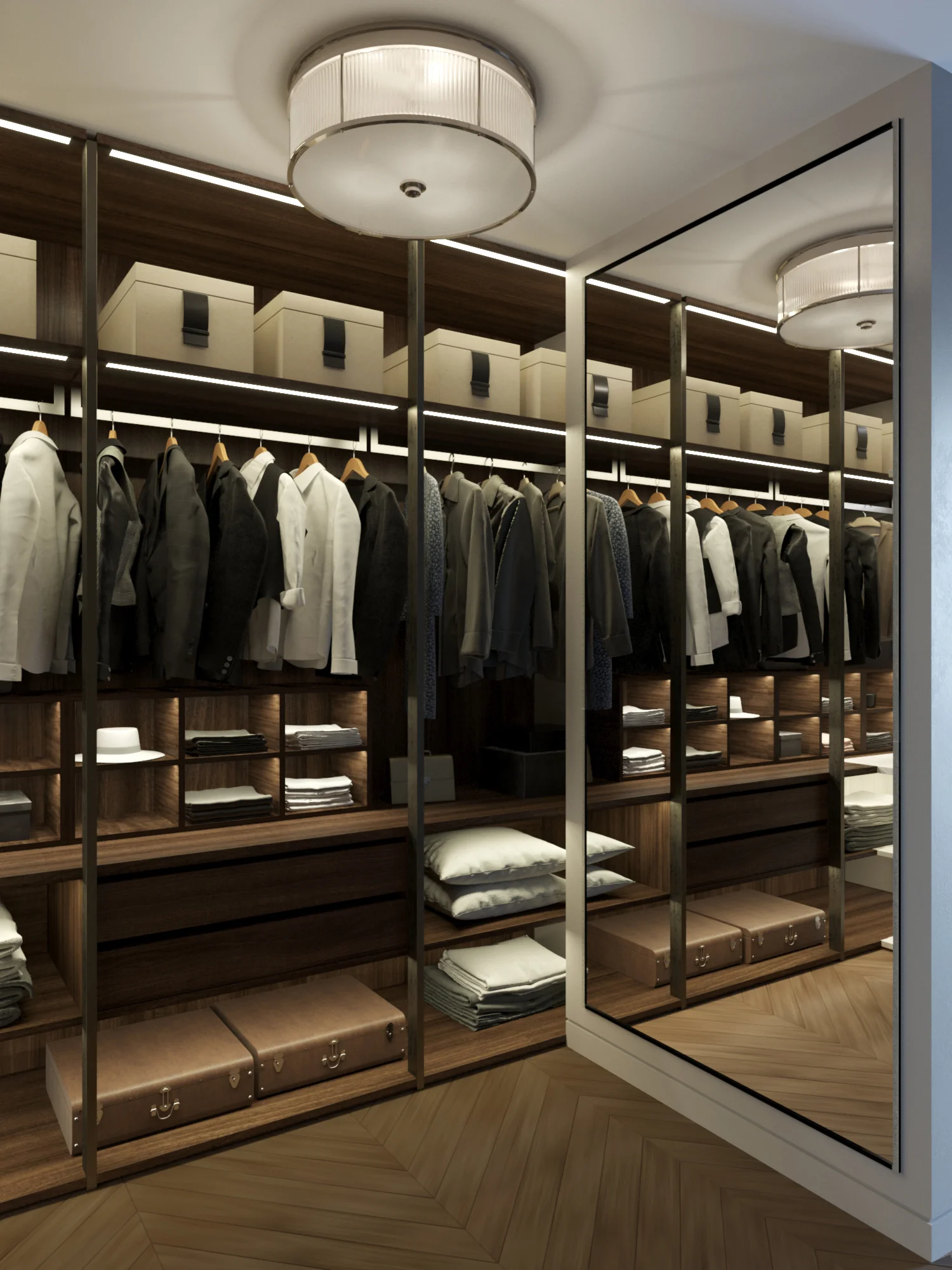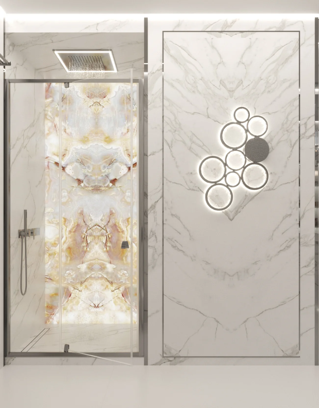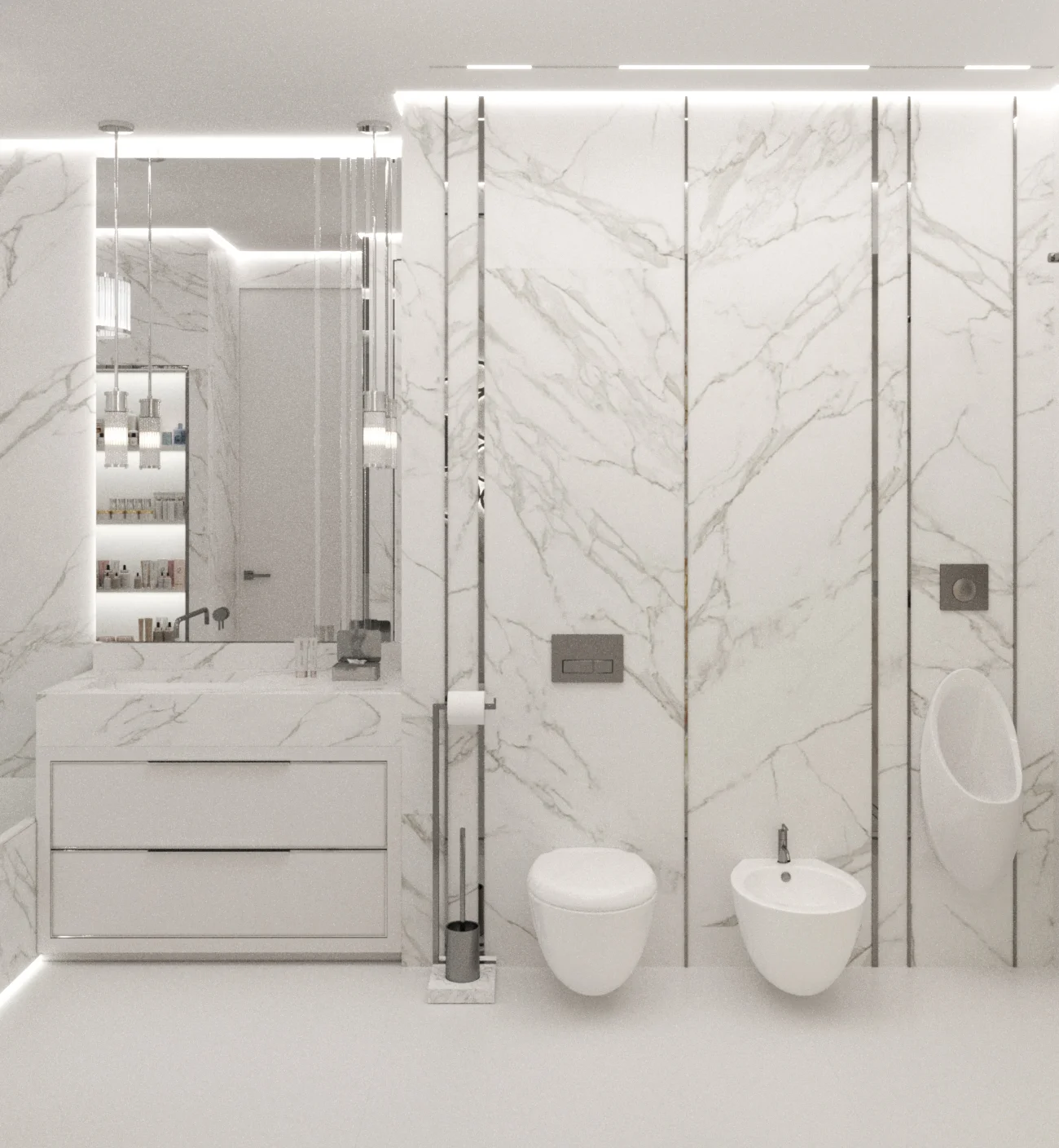 В спальне — мягкая панель с ламелями и тёплый контурный свет. Гардеробная как аккуратный бутик: каждая полка подсвечена. Гостевую сделали кабинетом-дневной: раздвижной стеллаж зонирует, диван превращается в кровать, шторы собирают всю палитру. В ванных — белый мрамор, тонкие металлические вставки, ниши и «парящие» приборы.