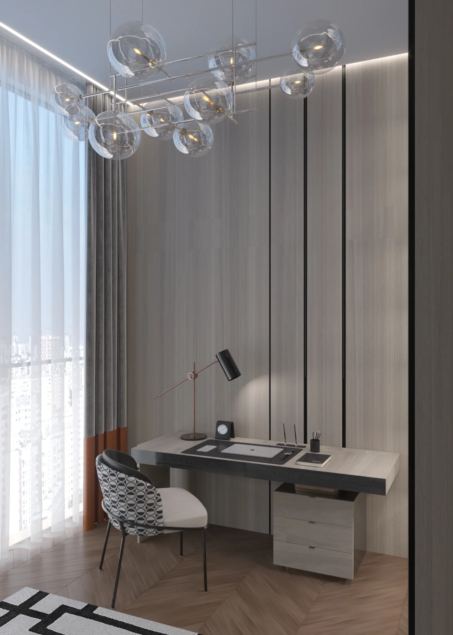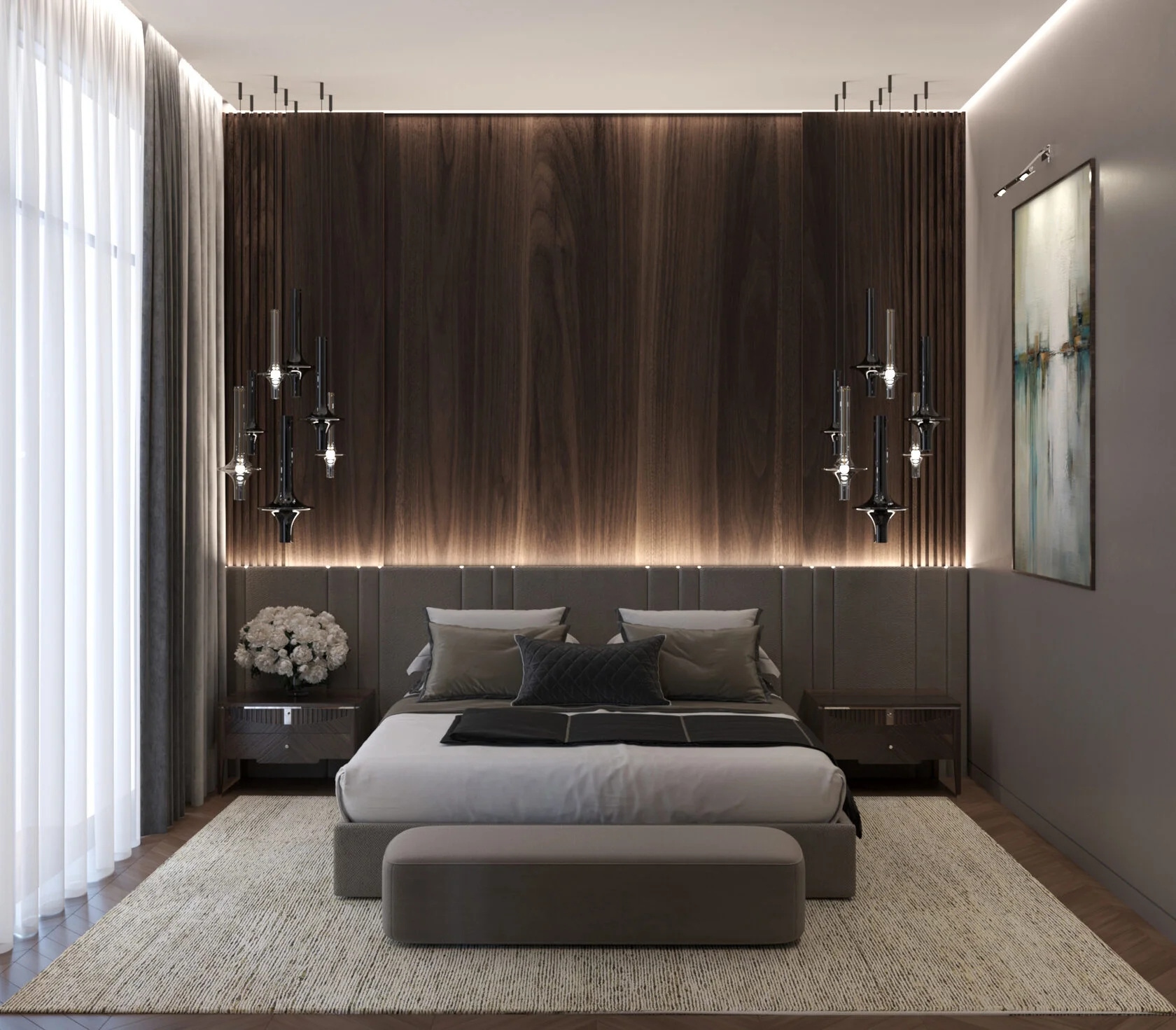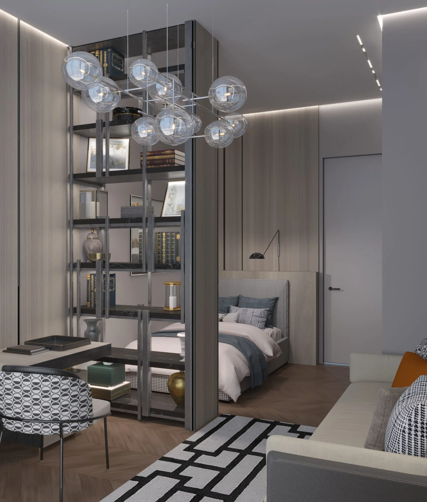 Заказчик сформулировал просто: «Хотим тишину и эстетику пентхауса — у себя дома». Мы выбрали современный арт-деко: тёплый шпон, мрамор, металл и дозированный блеск.