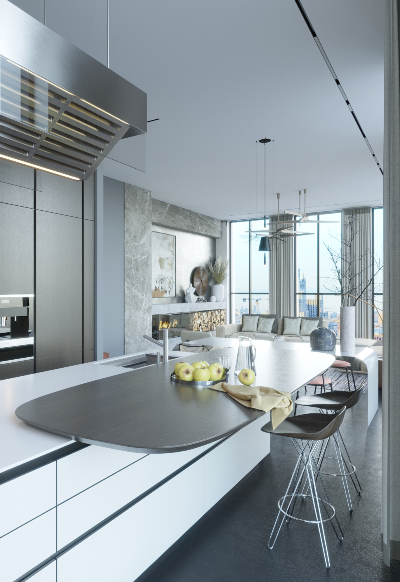 Гостиная и кухня идут одним дыханием. Каменный портал с узкой линией огня задаёт горизонт; остров мягко перетекает в обеденный стол с радиусной кромкой. Высокие фасады прячут технику, стулья на тонких опорах держат лёгкий ритм. Свет — сценографичный: треки, подвесы-«конструкторы», вечерний контур, который собирает пространство.