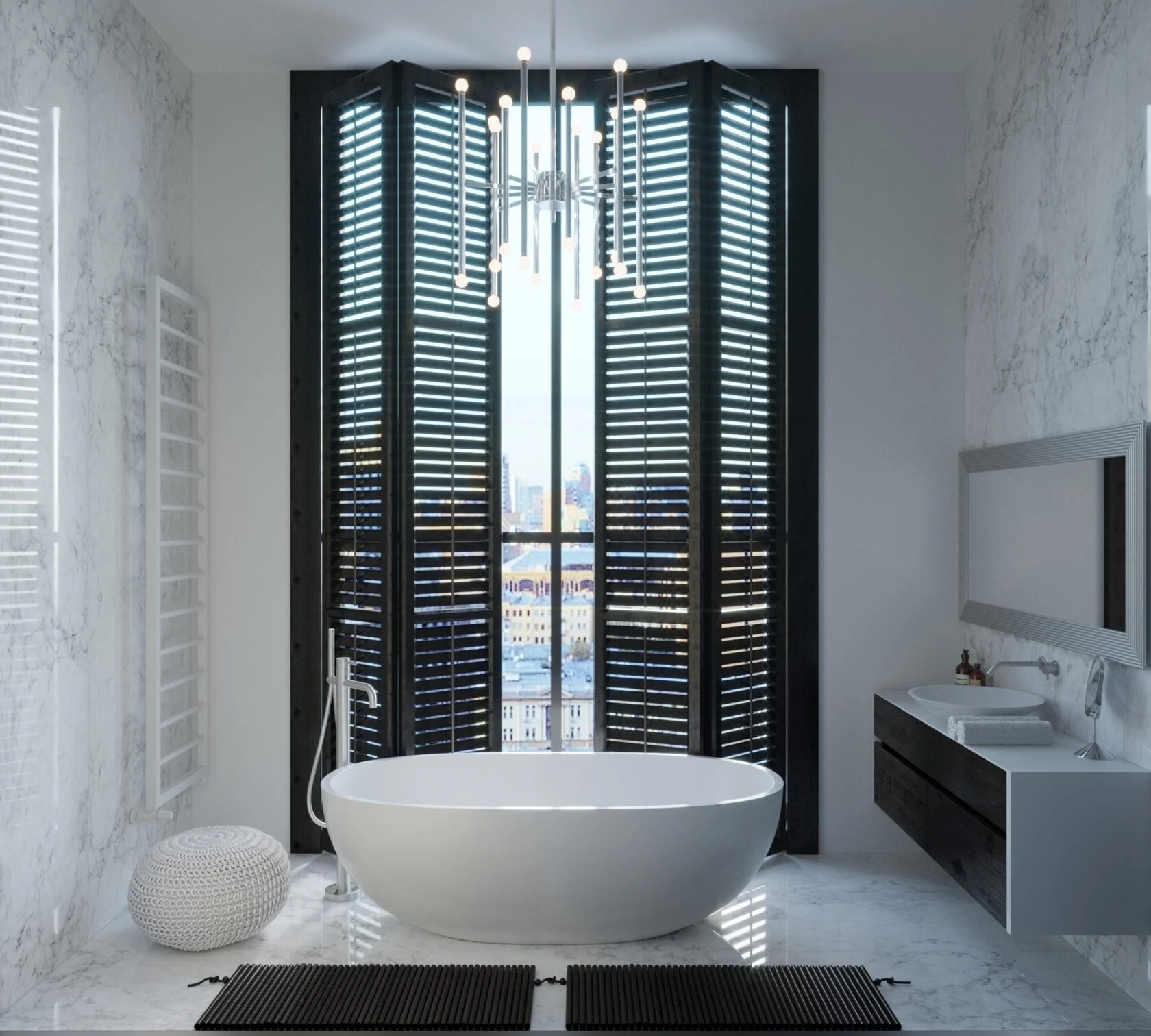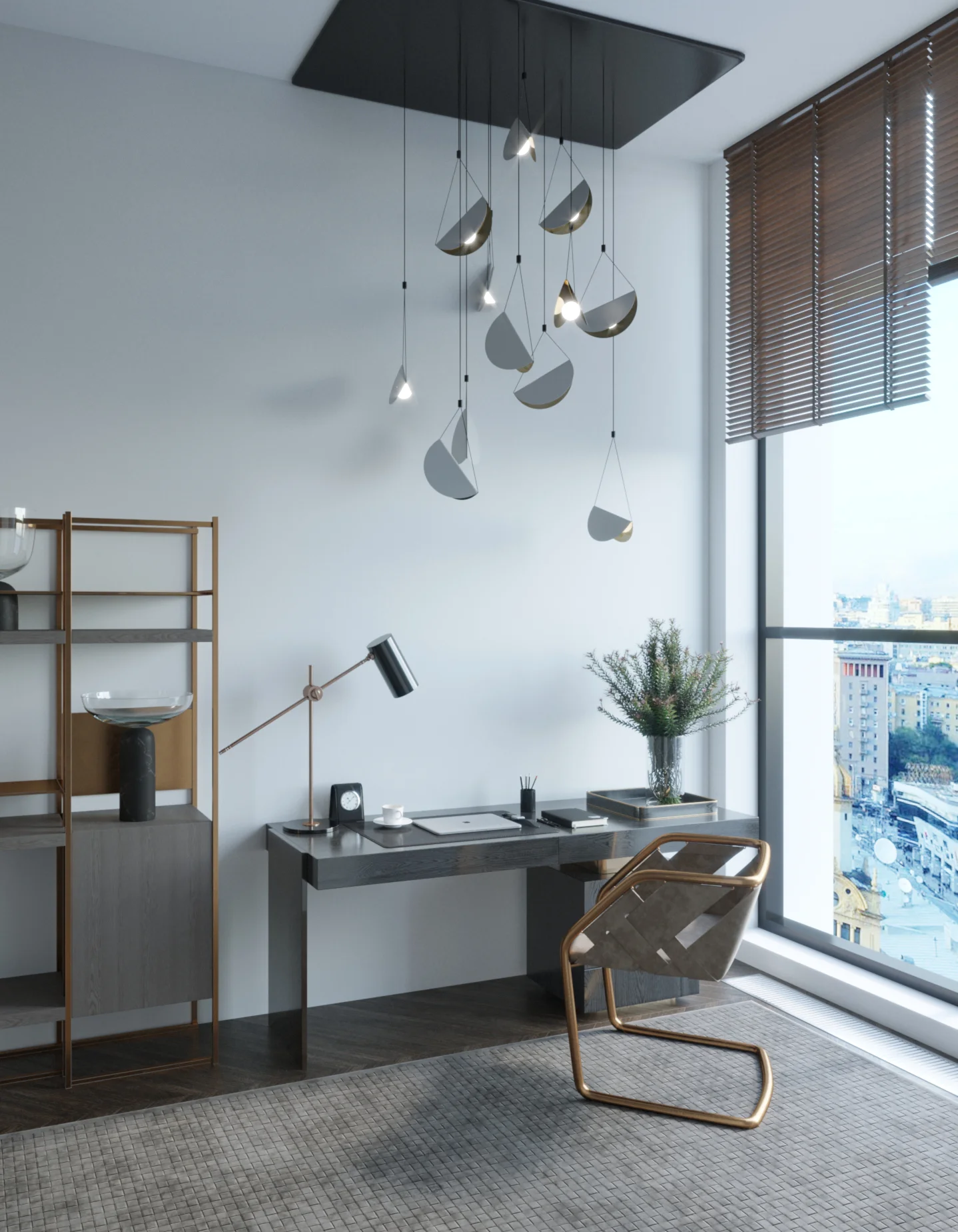 Спальня — про замедление: низкая кровать, многослойный текстиль, абстракция с изумрудными мазками и светильник из «лунных» дисков. Кабинет собран как чертёж: тёмное дерево, открытый стеллаж с теплыми металлическими стойками, графичное кресло и подвес-мобайл. Ванная — чистая композиция: отдельностоящая чаша у окна, чёрные ставни, белый камень и «парящая» тумба без лишних слов.